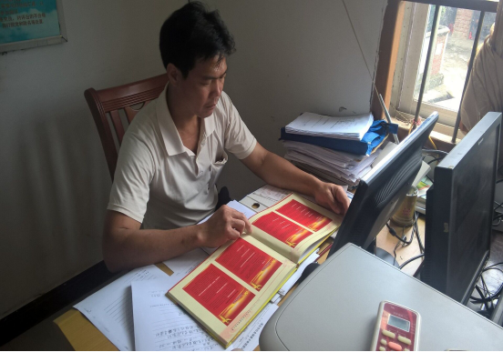 (图为大麦山镇村干部利用工作闲暇之余学习《反腐倡廉教育图片展手册》)