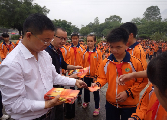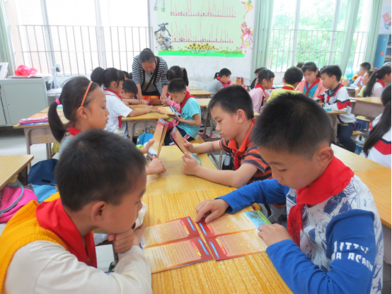 (图为县民族小学在派发《瑶族廉洁文化典故》)