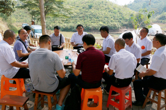 ▲党员干部在黄坌知青茶场分组学习讨论。
