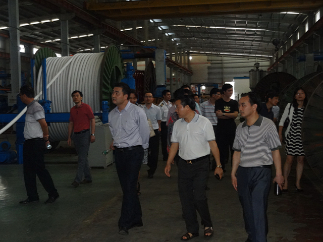 图为:韦世彪同志(左三)带领区纪委监察局党员干部参观新亚光公司的生产一线现场