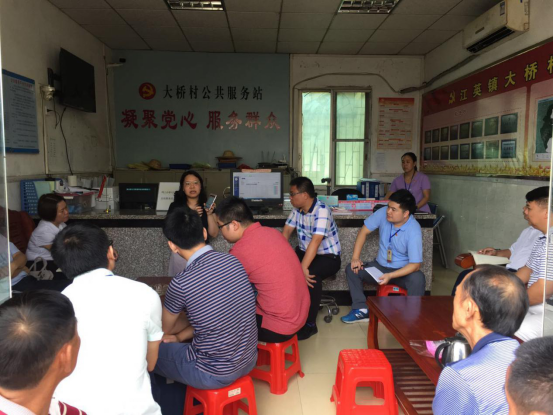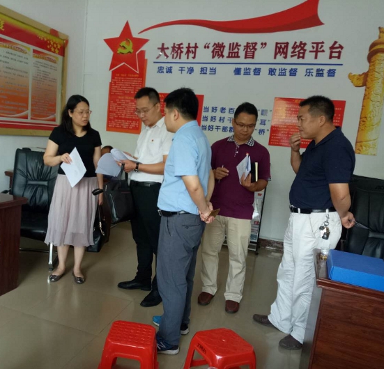 江英镇大桥村是市纪委推行勤廉监督系统部署应用的试点村。为实地了解勤廉监督平台的应用状态,为下一步在阳山各乡镇全面有效铺开勤廉监督系统应用工作,7月26日上午,由市纪委文进、陈海茹等人组成的市调研督导工作组到大桥村调研督导勤廉监督系统部署应用情况。县纪委副书记、县监察委副主任何际平率县纪委党风政风监督室全体干部、各乡镇纪委书记、各乡镇社会事务办负责人、大桥村“两委”干部、大桥村勤廉监督室全体成员和村务监督委员会全体成员共38人参与了调研督导活动。