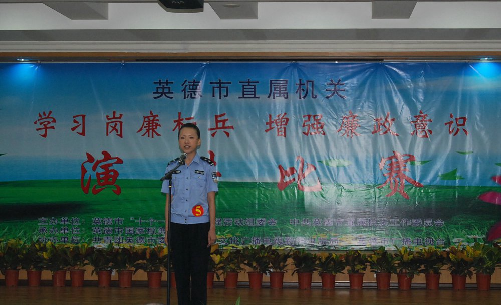 8月25日下午,由英德市直工委主办,英德市文广新局、团市委、广播电视台协办的英德市“学习岗廉标兵,增强廉政意识”演讲比赛在承办单位英德市国税局8楼会议厅举行。英德市纪委副书记、监察局局长吴道强出席演讲比赛活动并致词,英德市纪委副书记李满洪,市纪委常委赖日专、市直工委书记杨焕其等领导以及英德市直各单位近200名党员干部代表观看了演讲比赛。