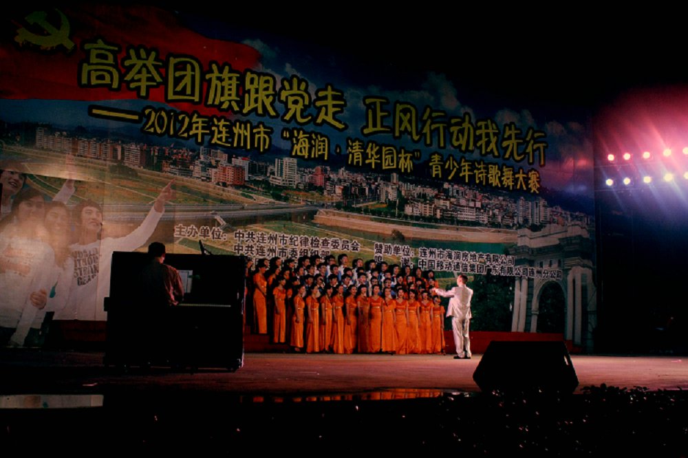 4月23日,“高举团旗跟党走、正风行动我先行”2012年连州市海润清华园杯青少年诗歌舞大赛在连州市文化广场举行。吸引了众多连州市民前来观赏。此次大赛由中共连州市纪委、连州市委组织部、团市委、市教育局、清远市侨界青年联合会、连州市侨联联合主办。