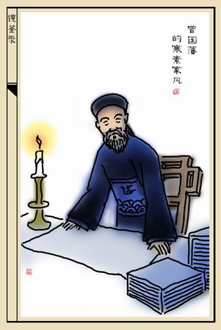 他的曾祖父曾制定治家信条八个字:“早、扫、考、宝、书、蔬、猪、鱼。”这八个字的意思是第一要早起,第二打扫清洁,第三诚修祭祀,第四善待亲邻。其余四字:就是读书、种菜、饲鱼、养猪。曾国藩幼承庭训,对上一辈所订之俭朴家规,信守不渝,在其致长子纪泽信中曾说:“勤俭自持,习劳习苦,可以处乐,可以处约,此君子也。余服官三十年,不敢稍染官宦气息,饮食起居,尚守寒素家风,极俭可也,略丰亦可,大丰则我不敢也。凡仕宦之家,由俭入奢易,由奢返俭难。尔年尚幼,切不可贪爱奢华,不可习惯懒惰,不论大家小家,仕农工商,勤苦守约,未有不兴,骄奢倦怠,未有不败。”