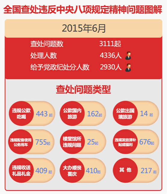 ●2015年6月全国查处违反中央八项规定精神问题3111起——