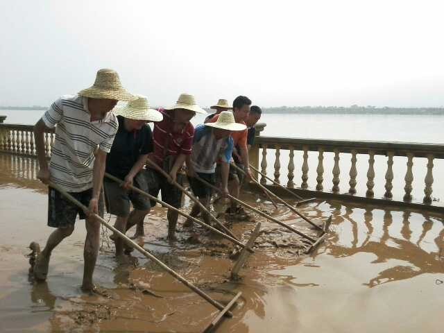 图为英德市纪委干部职工在清扫滨江公园淤泥