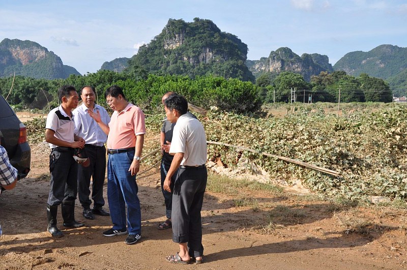 图为梁润江书记在九龙镇团结村指导救灾复产