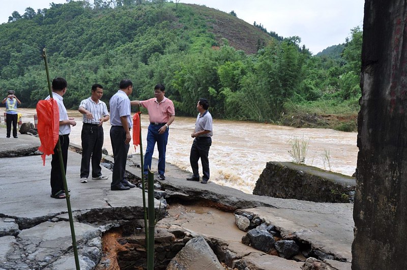 图为英德市委常委、纪委书记梁润江在九龙镇现场察看县道X366线道路损坏情况
